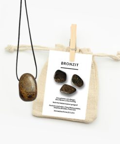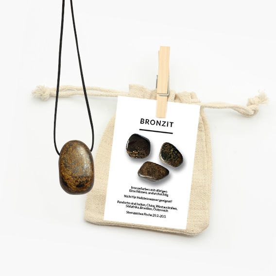 Zur optimalen Aufbewahrung wird der wunderschöne Bronzit Trommelstein Anhänger in einem Natur-Jutebeutel geschützt. Eine ausführliche Beschreibungskarte wird mitgeliefert. Auf dieser sind allgemeine Informationen sowie die Heilwirkungen auf Körper, Geist und Seele gut zum Immer-wieder-Nachlesen zusammengefasst.