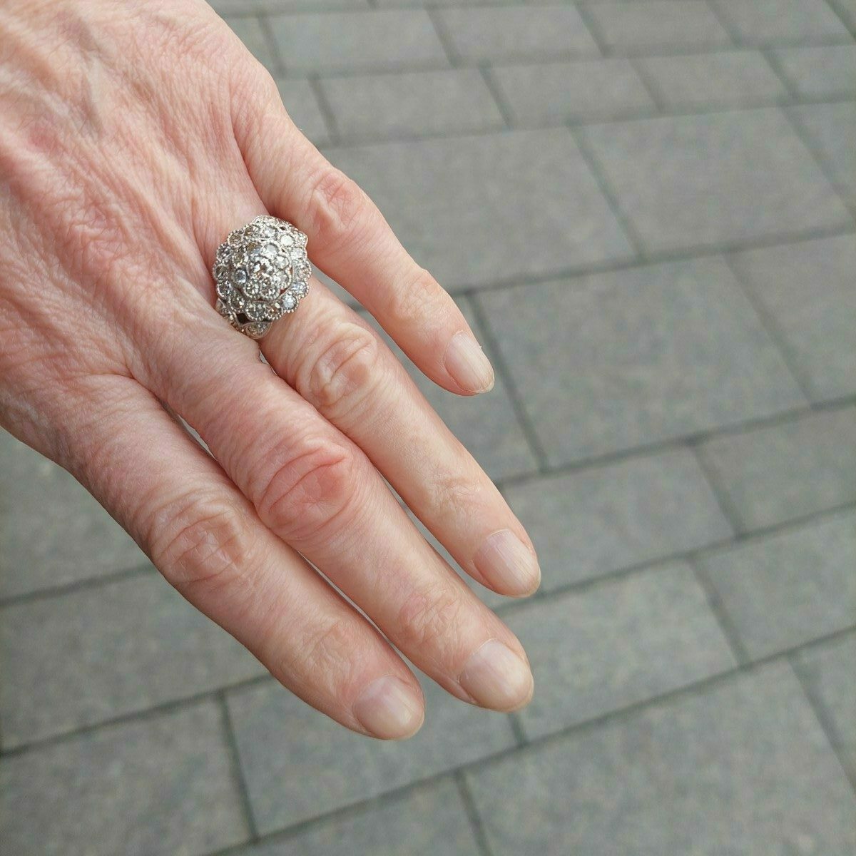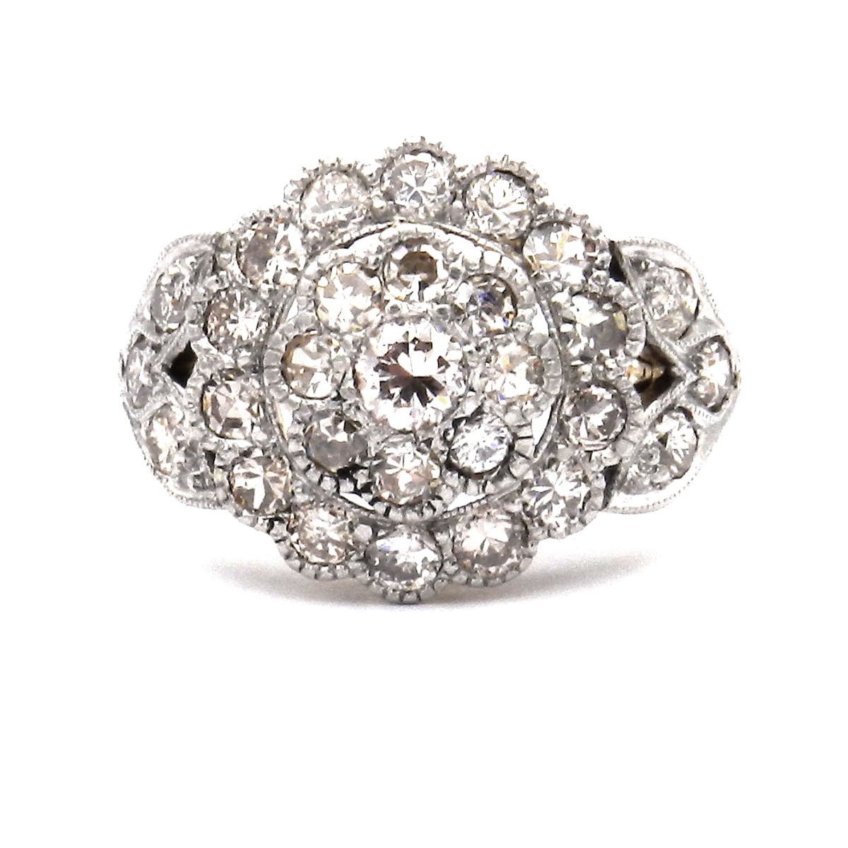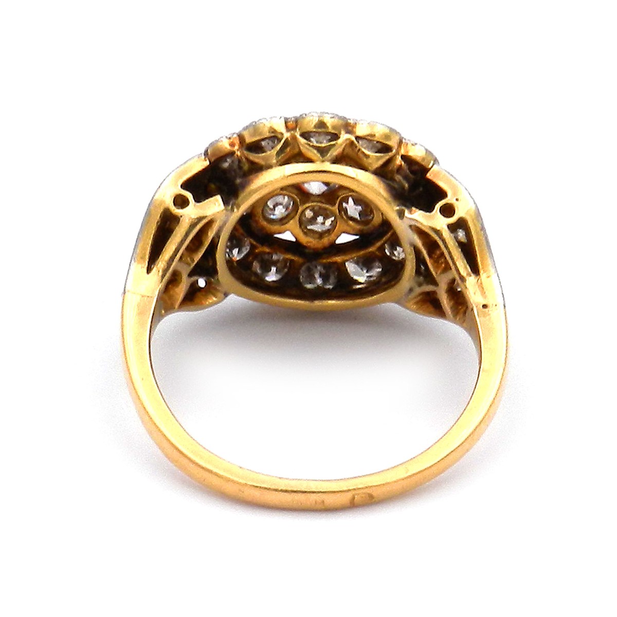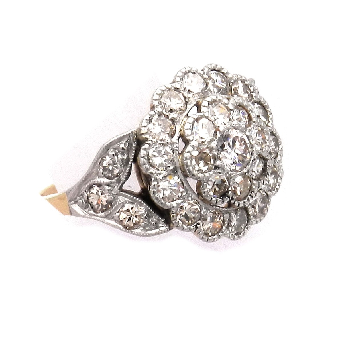 Sehr dekorativer Diamant Ring mit blütenförmigem Ringkopf aus Gelbgold und Platin, die gestufte Rosette ausgefasst mit 23 strahlenden Altschliff Diamanten, seitlich von Blättchen flankiert und mit je 3 weiteren Diamanten besetzt, insges. 29 Altschliff Diamanten mit zus. 1.65 ct H-J/si in einer feinen Millegriffe Fassung aus Platin.