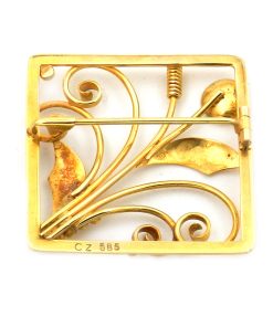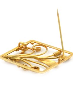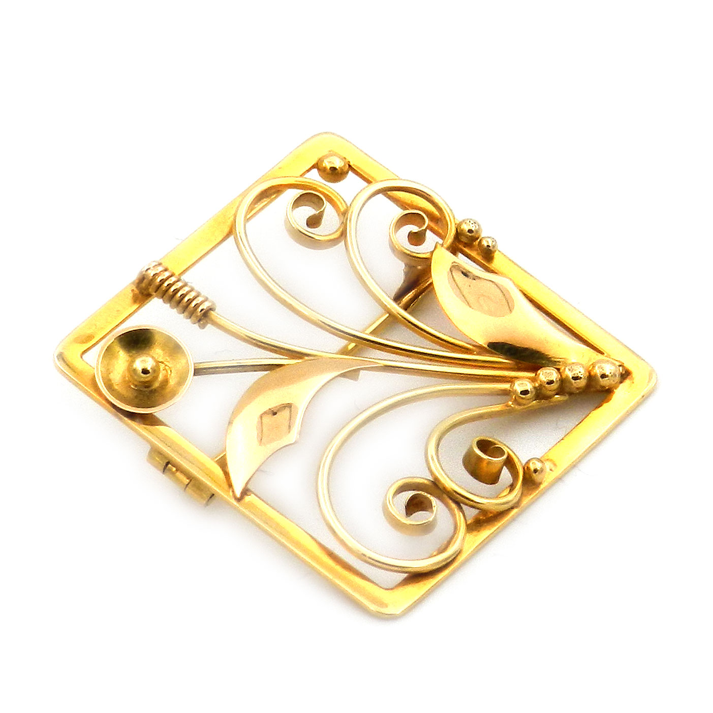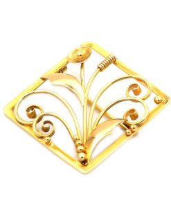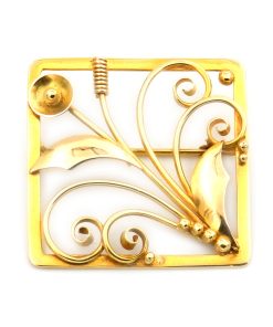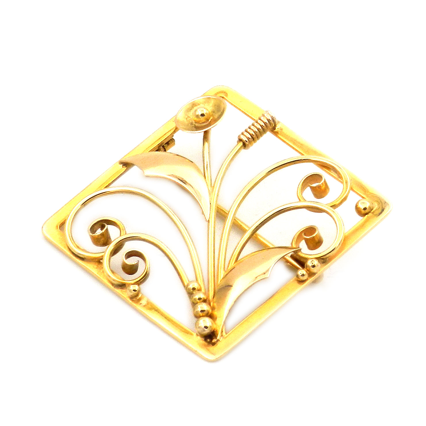 Dekorative Gold Brosche mit der Darstellung einer stilisierten Blume aus filigranem Golddraht in quadratischer Rahmung. In kunstvoller Handarbeit sind die einzelnen Blätter zu lebhaften Voluten gedreht und werden zusätzlich von Goldgranulationen akzentuiert.