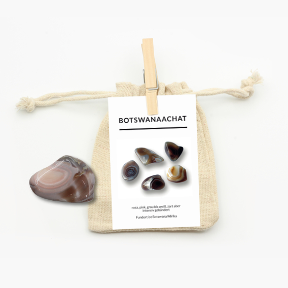Zur optimalen Aufbewahrung wird der pinke Botswanaachat-Trommelstein in einem Natur-Jutebeutel geschützt. Eine ausführliche Beschreibungskarte wird mitgeliefert. Auf dieser sind allgemeine Informationen sowie die Heilwirkungen auf Körper, Geist und Seele gut zum Immer-wieder-Nachlesen zusammengefasst.