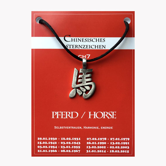 Die Anhänger sind aus nickelfreiem Zinn gefertigt, auf ein Seidenband gefädelt und attraktiv auf einer detaillierten Beschreibungskarte in einer Zellophanverpackung drapiert. Die 12 Sternzeichen werden durch die Glücksmünze und dem Yin Yang Amulett ergänzt.