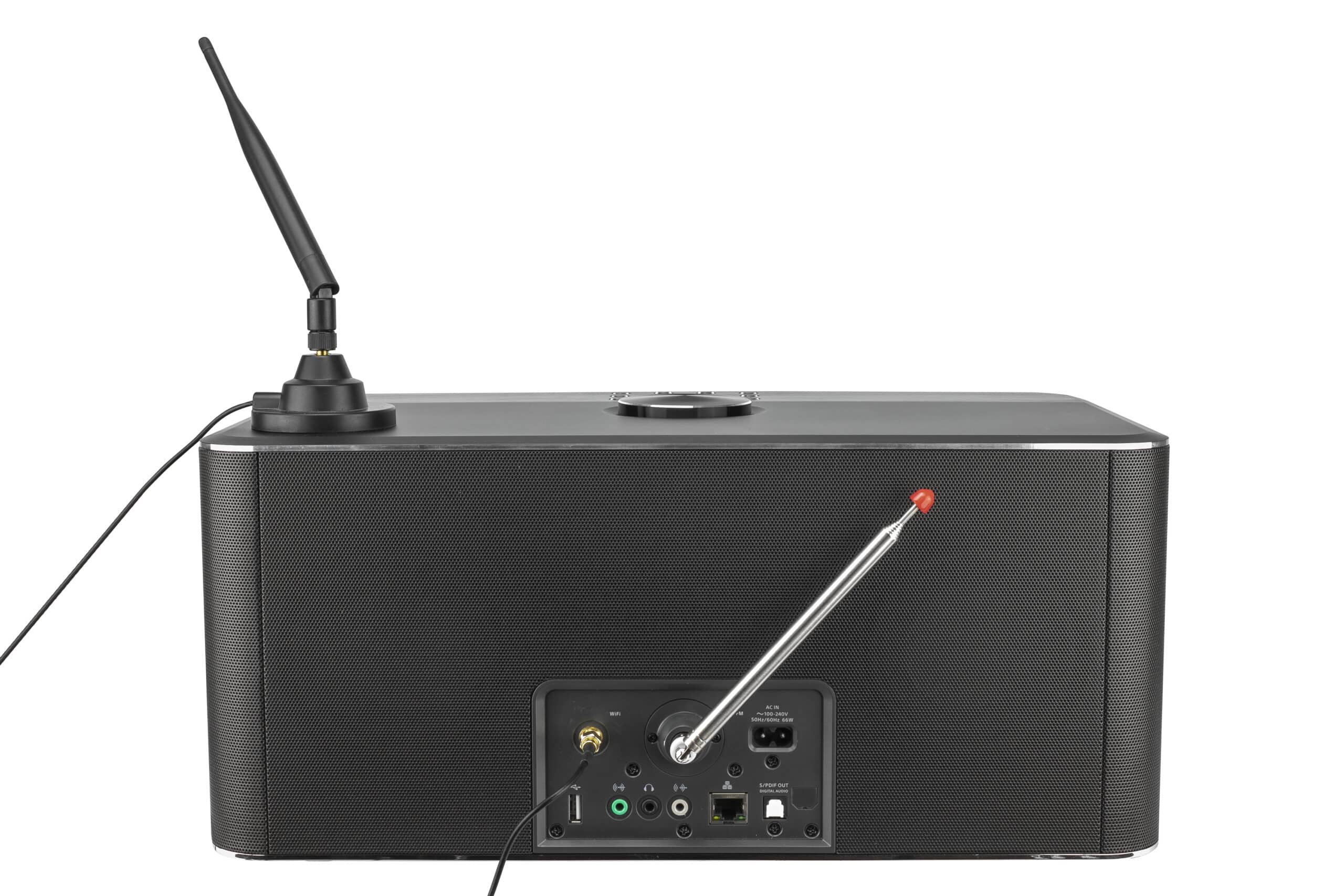 Ultimatives stereo All-in-One System, Top Sound und Verarbeitung, akustisch abgestimmtes Vollmetall-Gehäuse, Stereo Class-D-Verstärker und Subwoofer, Internet-/DAB+/FM-Radio, Bluetooth, CD-Laufwerk, Streamingdienste (Amazon Music/Spotify/Deezer), Aufnahmefunktion auf SD und USB, Hintergrundbeleuchtetes 3,2″-Farbdisplay, UNDOK APP Android/iOS, NFC Funktion