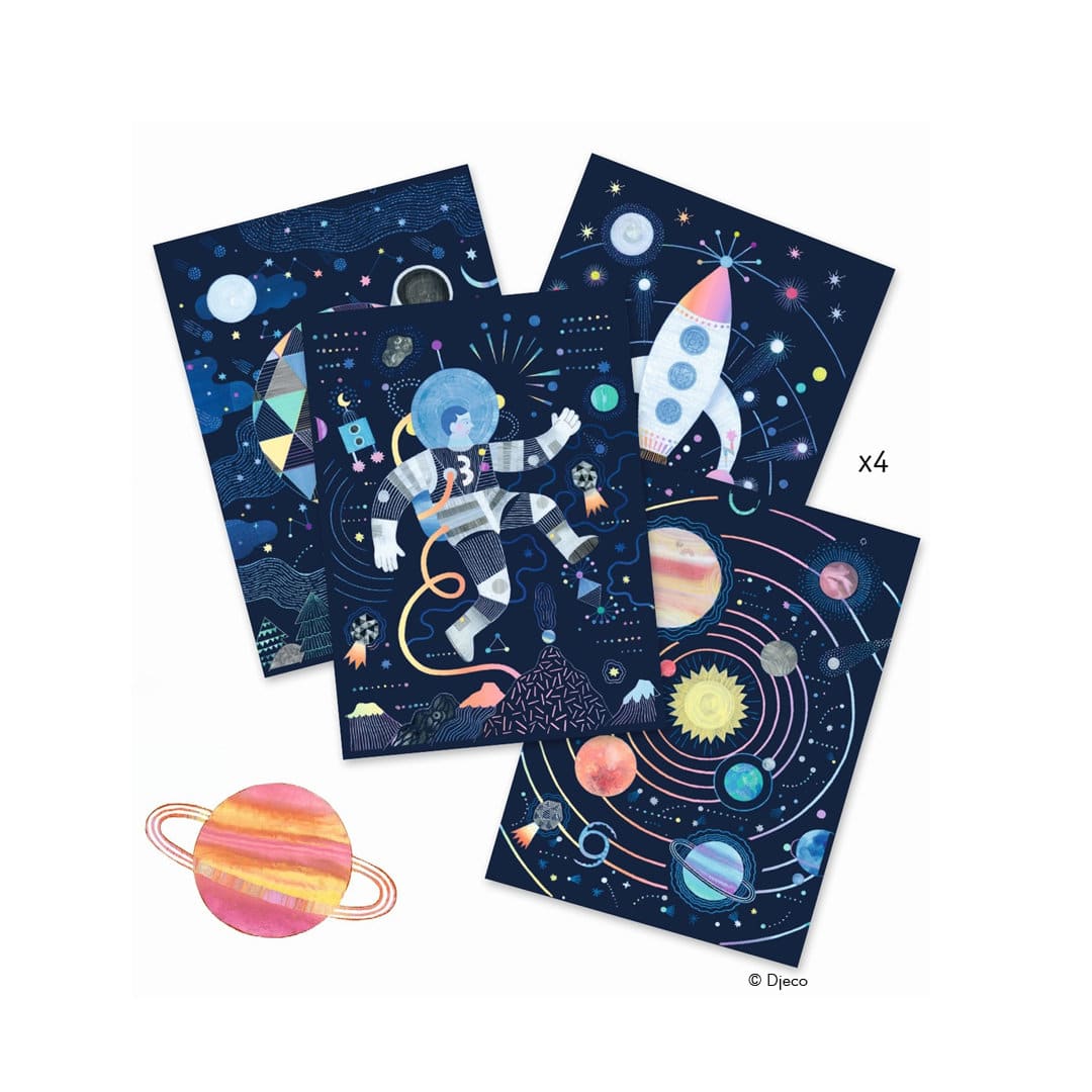 Bastelset Kratzbilder „Weltall“ mit 4 Vorlagen rund um das Thema Weltraum zum Freikratzen, von Djeco.
