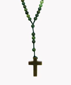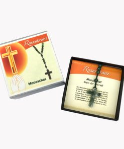Der kunstvoll gefertigte Rosenkranz aus Moosachat grün Edelstein ist auf hochwertigem Band geknüpft.