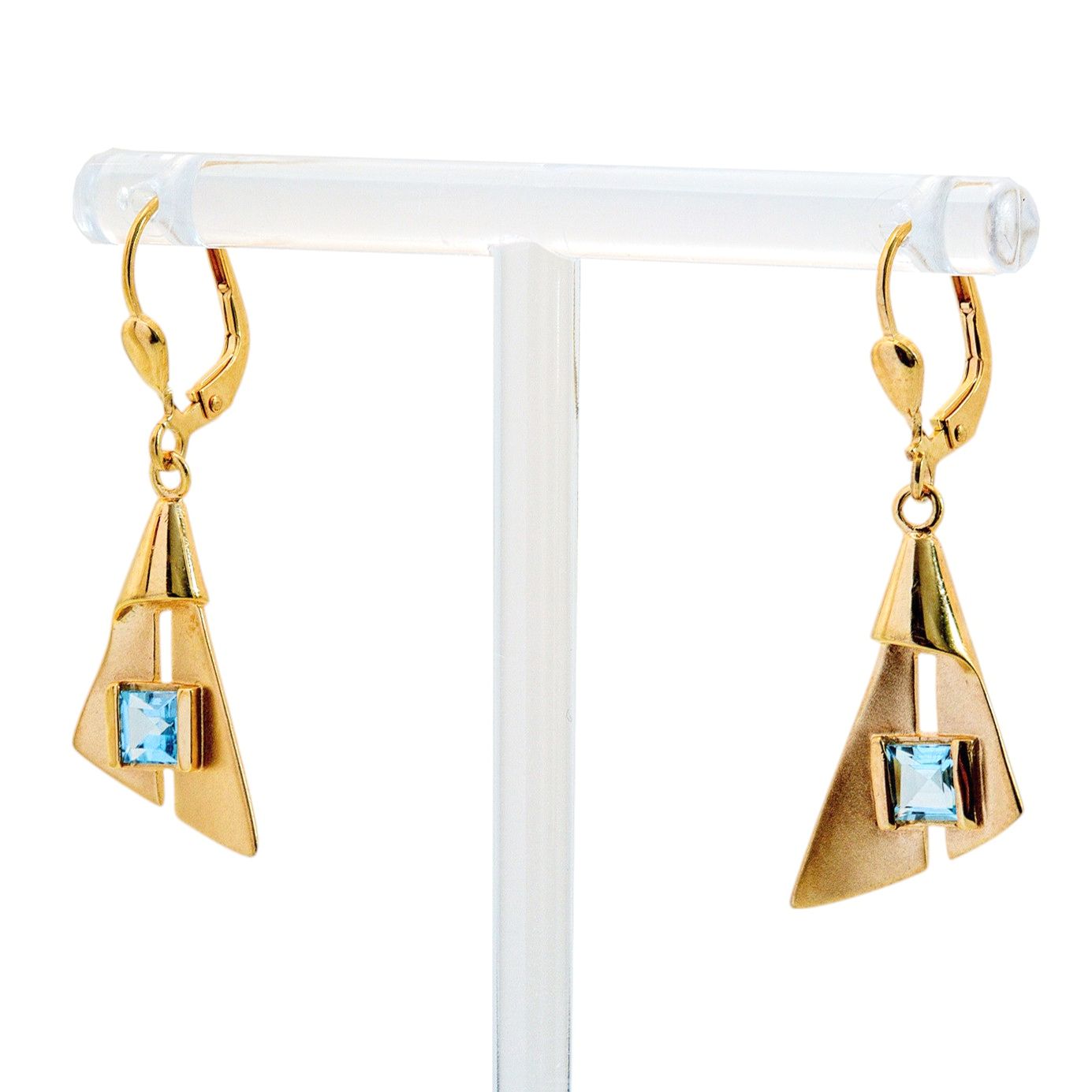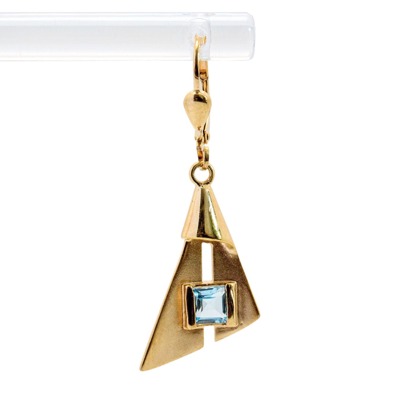 Diese eleganten Ohrringe aus 8 Karat Gelbgold vereinen modernes Design mit zeitloser Eleganz. Die kunstvolle, geometrische Form wird durch einen funkelnden, quadratisch geschliffenen Blautopas ergänzt, der mit seinem strahlenden Blau einen faszinierenden Kontrast zum warmen Goldton bildet. Die hochwertigen Klappbrisuren sorgen für sicheren Tragekomfort. Ob als edles Accessoire für besondere Anlässe oder stilvoller Begleiter im Alltag – diese Ohrringe setzen ein individuelles Statement.
