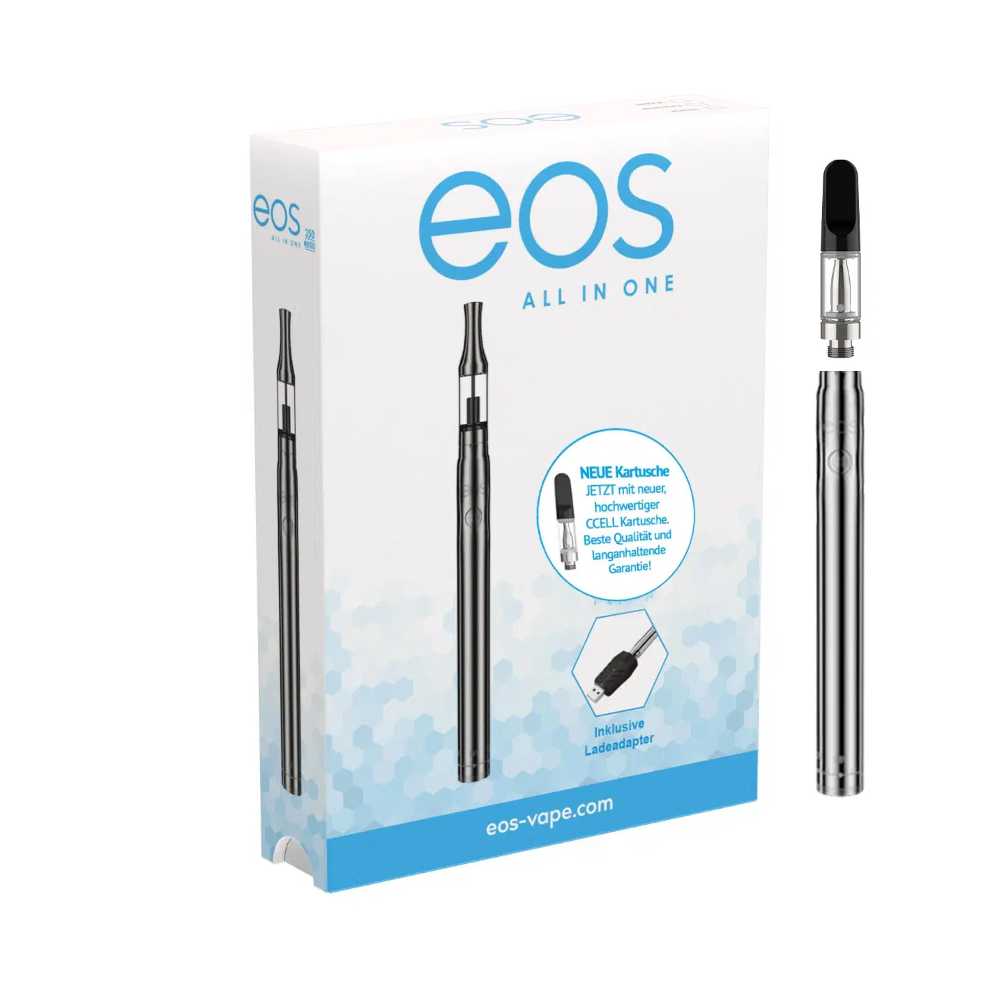 Der eos Vape Pen besteht aus einem wiederaufladbaren Akku und einer nachfüllbaren eos Kartusche mit Mundstück. Der Eos Vape Pen wurde speziell für das Verdampfen von CBD E-Liquids entwickelt. Der EOS CBD Vaporizer Pen wird inklusive Ladekabel und Bedienungsanleitung geliefert.