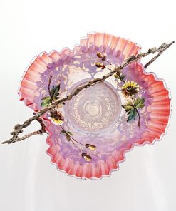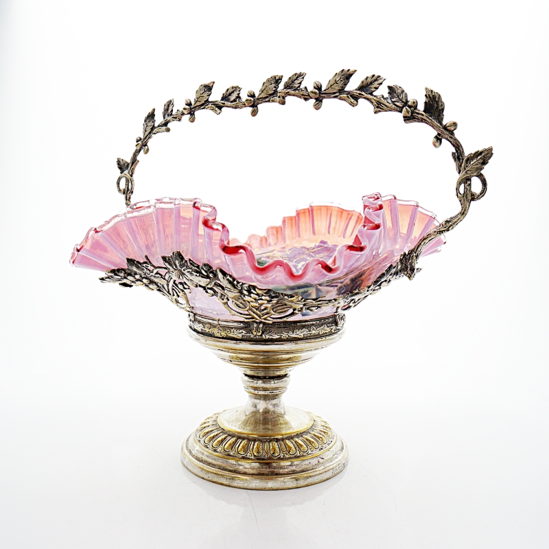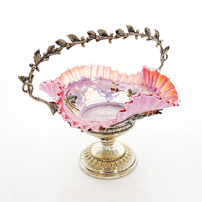 Herrliche versilberte Fußschale auf rundem gestuftem, mit Historismusfries dekoriertem Stand. Der Schalenkörper mit durchbrochen gearbeitetem Rebendekor besitzt eine Handhabung in Form einer Weinranke. Der mundgeblasene Glaseinsatz mit gefächertem Rand ausladender Formgebung ist hochwertig handbemalt und besitzt ebenso feine Goldverzierungen. Keine Beschädigungen.