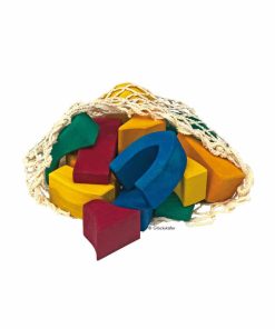 17-teiliges Ensemble aus bunten oder naturbelassenen Holzbausteinen in freien Formen, im Baumwollnetz.