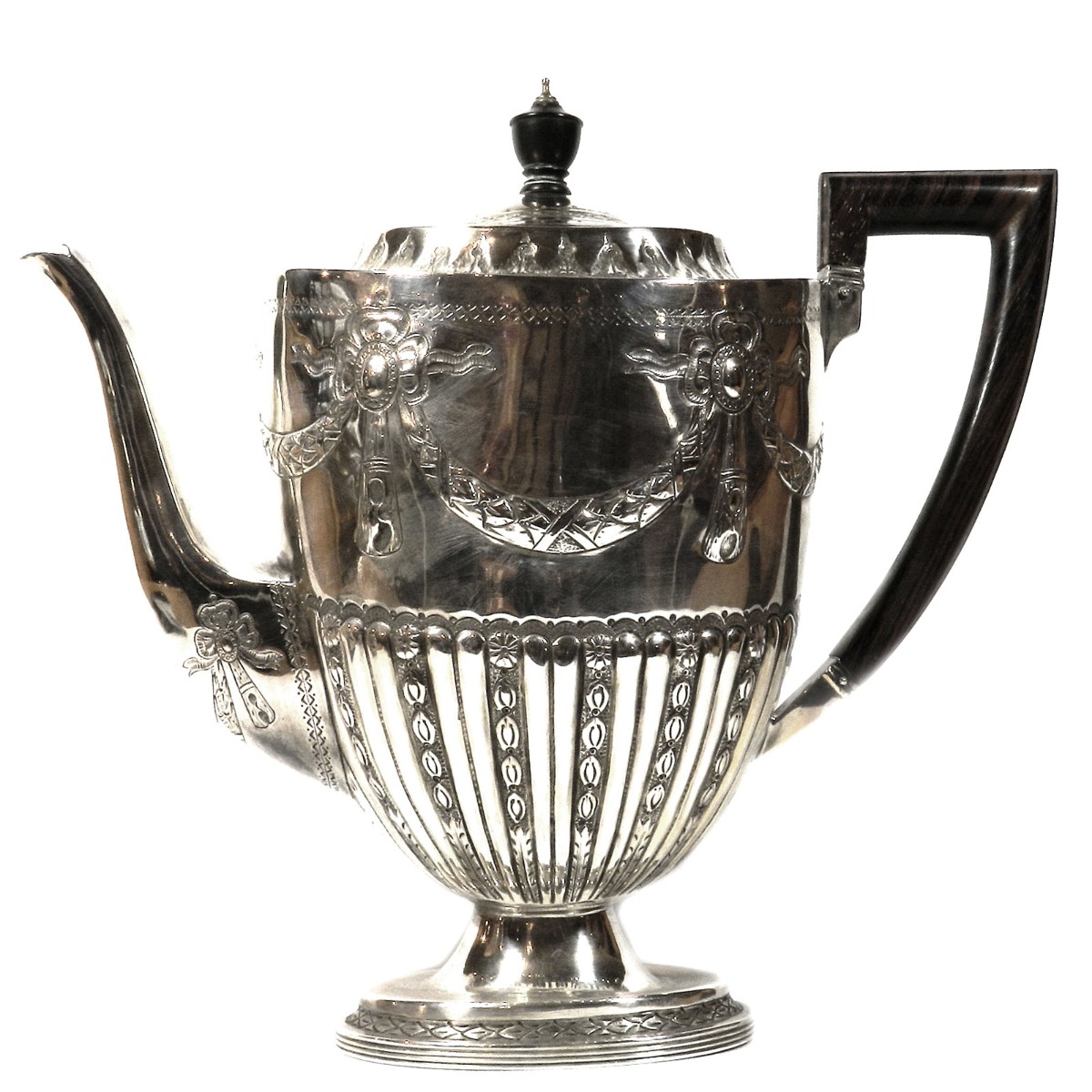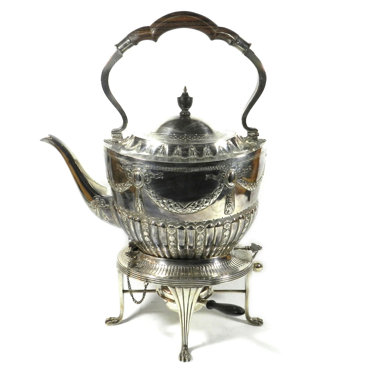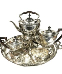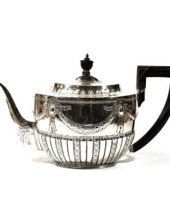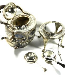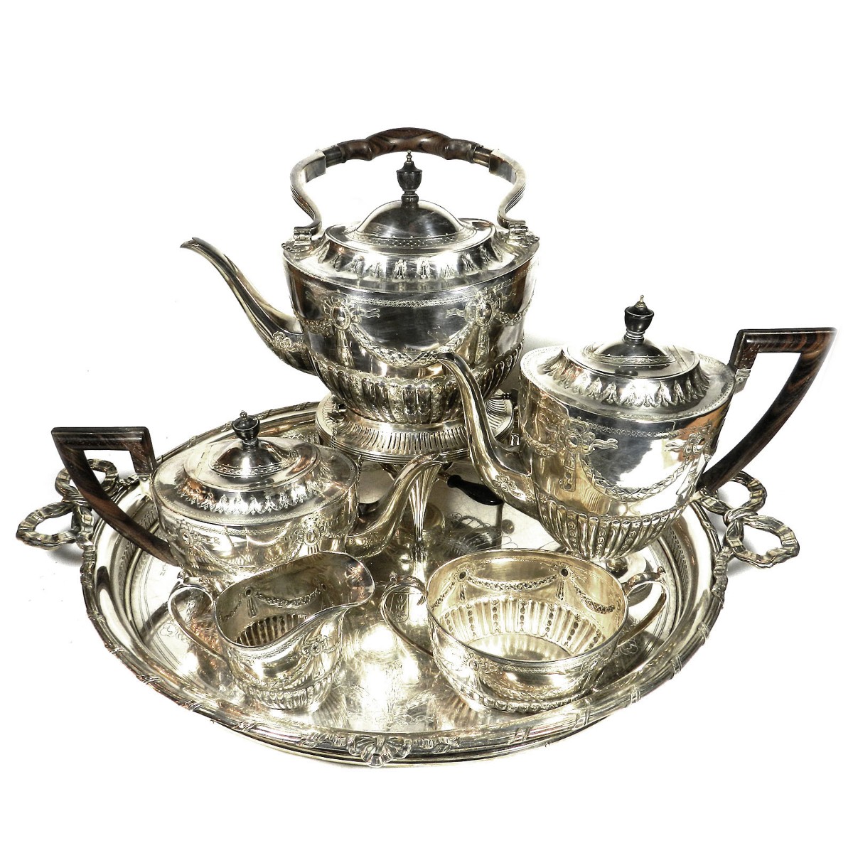 Großer ovaler Heißwasserkessel mit schwenkbarem Henkel, leicht gemuldete Schulter, gewölbter Deckel mit ovalem Knauf, geschweifte Tülle. Durch herausziehbare Stifte fest verbunden mit einem Rechaud auf vier Tatzenfüßen, in der Mitte Spiritusbrenner mit verstellbarem Docht. Die Kaffeekanne in Helmform auf eingezogenem Fuß, entsprechende ovale Teekanne mit rückseitigem J-Henkel. Passendes Sahnekännchen und Zuckerdose. Auf den Wandungen Pfeifendekor und umlaufende reliefplastische Blattfestons, die Ränder von fein gravierten Blattbordüren umzogen. Knäufe und Henkel in Holz. Großes ovales Tablett mit durchbrochenem Galerierand und graviertem Boden und schleifenförmigen Griffen.