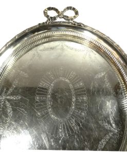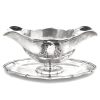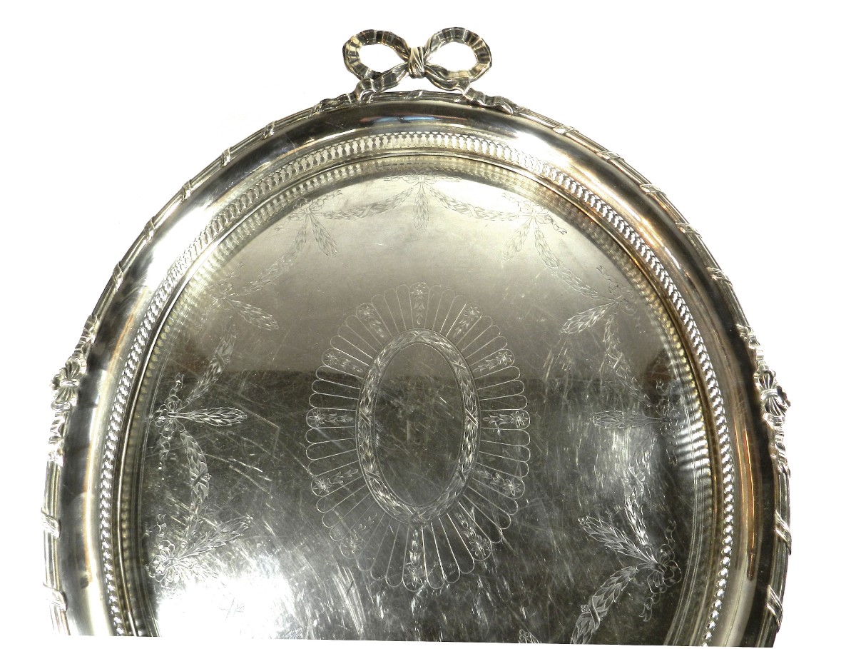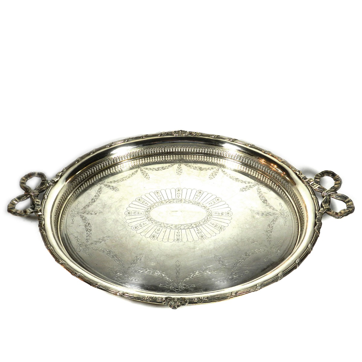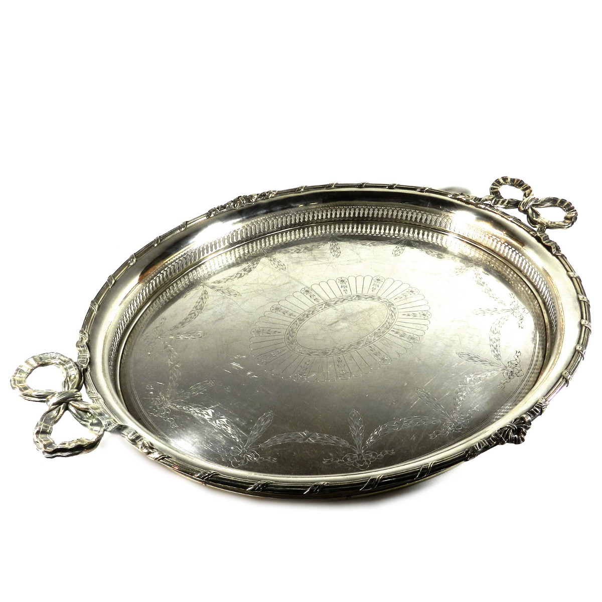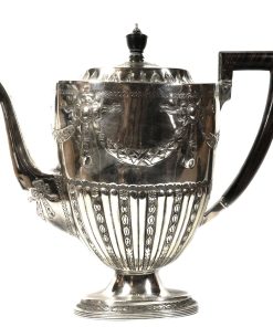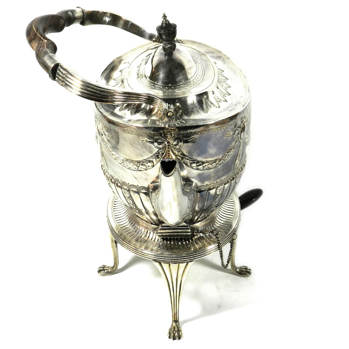 Großer ovaler Heißwasserkessel mit schwenkbarem Henkel, leicht gemuldete Schulter, gewölbter Deckel mit ovalem Knauf, geschweifte Tülle. Durch herausziehbare Stifte fest verbunden mit einem Rechaud auf vier Tatzenfüßen, in der Mitte Spiritusbrenner mit verstellbarem Docht. Die Kaffeekanne in Helmform auf eingezogenem Fuß, entsprechende ovale Teekanne mit rückseitigem J-Henkel. Passendes Sahnekännchen und Zuckerdose. Auf den Wandungen Pfeifendekor und umlaufende reliefplastische Blattfestons, die Ränder von fein gravierten Blattbordüren umzogen. Knäufe und Henkel in Holz. Großes ovales Tablett mit durchbrochenem Galerierand und graviertem Boden und schleifenförmigen Griffen.