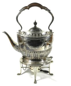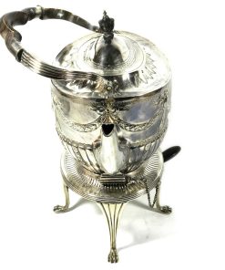 Dieses vielteilige Service zeichnet sich durch seine außergewöhnliche Größe und massive Verabeitung aus. Das klassizistische Dekor ist aufwendig aber nicht zu prunkvoll und fügt sich dank seiner edlen Eleganz auch in moderne Einrichtungen ein. Der Wasserkessel steht sicher auf dem Rechaud. Er wird mit Hilfe von zwei Stiften mit dem Stövchen verbunden. Löst man nur den Hinteren, lässt sich die Kanne zum Eingießen nach vorne kippen. Die Stifte werden an den kurzen Seiten eingesteckt. Der Brenner im Stövchen wird mit Spiritus gefüllt.