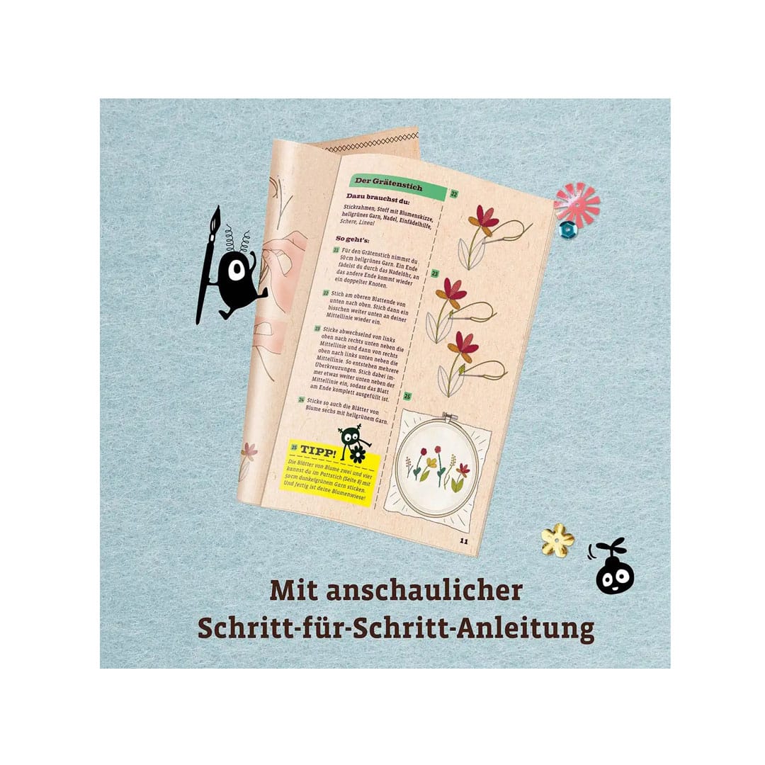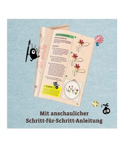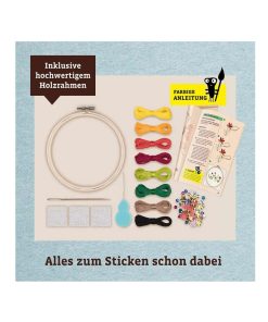 Lerne anhand der farbigen, bebilderten Anleitung, mit dem Stickrahmen aus Bambus und mit Stoff, den bunten Garnen und Pailletten zu arbeiten. Dieses Set beinhaltet eine hübsche Motiv-Vorlage sowie Ideen für eigene Stickbilder: eine verspielte Katze, eine Blumenwiese und ein ganz persönliches Lieblingsmotiv. Mit diesem Bastelset findest du einen Einstieg in unterschiedliche Sticktechniken. So kannst du kinderleicht auf den drei beiliegenden Stoffen die ersten selbstgestickten Motive gestalten.
