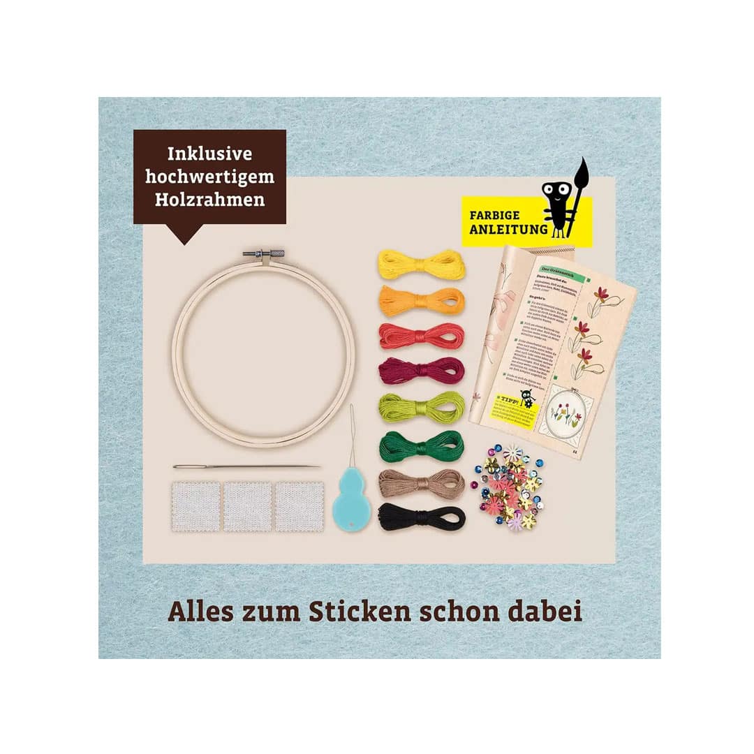 Bastel-Set Bastelbox „Sticken“ mit Stickrahmen und Zubehör zum Sticken lernen, inkl. illustrierte Schritt-für-Schritt-Anleitung,