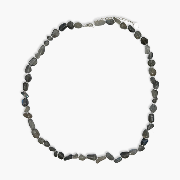 Die Nugget Kette aus Labradorit hat eine Länge von 45+5cm Verlängerung und einen 925 Silber Karabinerverschluss.