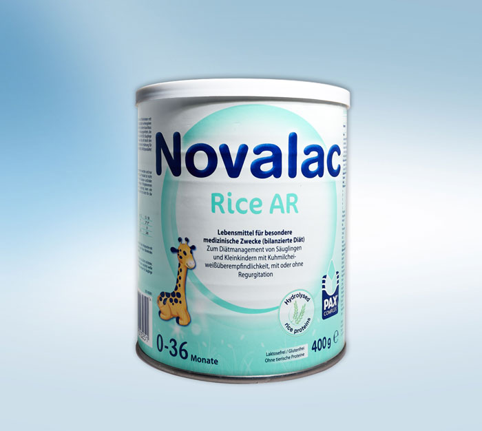 Novalac Rice AR ist ein diätetisches Lebensmittel für Säuglinge und Kleinkinder, die eine Unverträglichkeit auf Kuhmilcheiweiß mit oder ohne Regurgitation (Aufstoßen, Hochbringen von Nahrung aus Speiseröhre oder Magen ohne Übelkeit oder kräftige Kontraktionen der Bauchmuskeln) aufweisen.