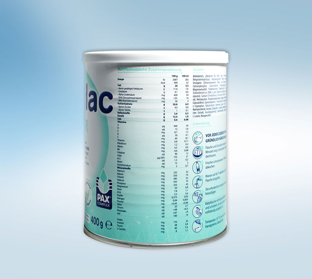 - enthält PAX® Complex, welcher wirksam das Aufstoßen reduziert, zur Normalisierung des Stuhls beiträgt (Durchfall oder Verstopfung), das Befinden und den Schlaf verbessert, das Weinen reduziert und in Folge zur besseren Qualität des Familienlebens beiträgt.