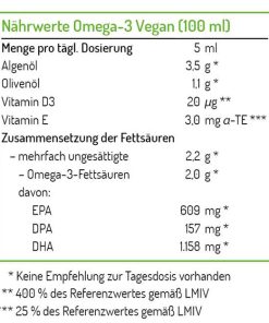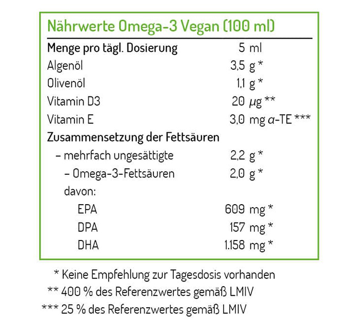 Das Algenöl enthält reichlich DHA (Docosahexaensäure) sowie die Fettsäure EPA (Eicosapentaensäure). Somit ist es ein optimaler veganer Omega-3 Lieferant für alle, die sich frei von tierischen Lebensmitteln ernähren wollen.