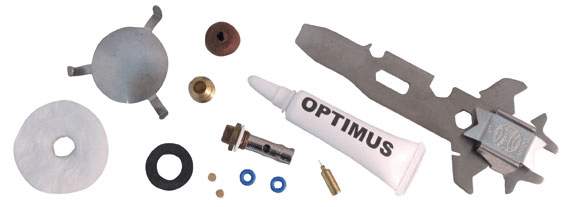 Contents: Cleaning needle, lubricant, nozzle, ignition wick, 2 O-rings for spindle, 2 fuel filters, pump valve, burner plate, pump leather, gasket for tank cap, multitool.