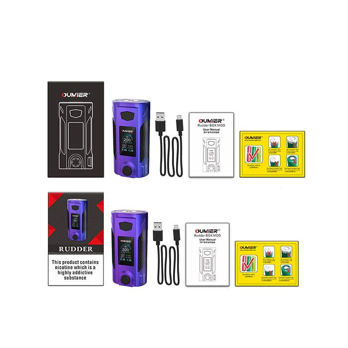 OUMIER Rudder MOD ist ein kompaktes und leistungsstarkes MOD mit hellem und großem OLED-Bildschirm und innovativem Drehwahltaster. Die Rudder Box Akkuträger wird von zwei 18650-Batterien und der maximalen Ausgangsleistung von 200 W mit verschiedenen Arbeitsmodi gespeist und ist für RTA / RDA / RDTA mit 510 Anschluss geeignet. Der Akkuträger unterstützt 4 Modi: VW / NI / TI / SS.