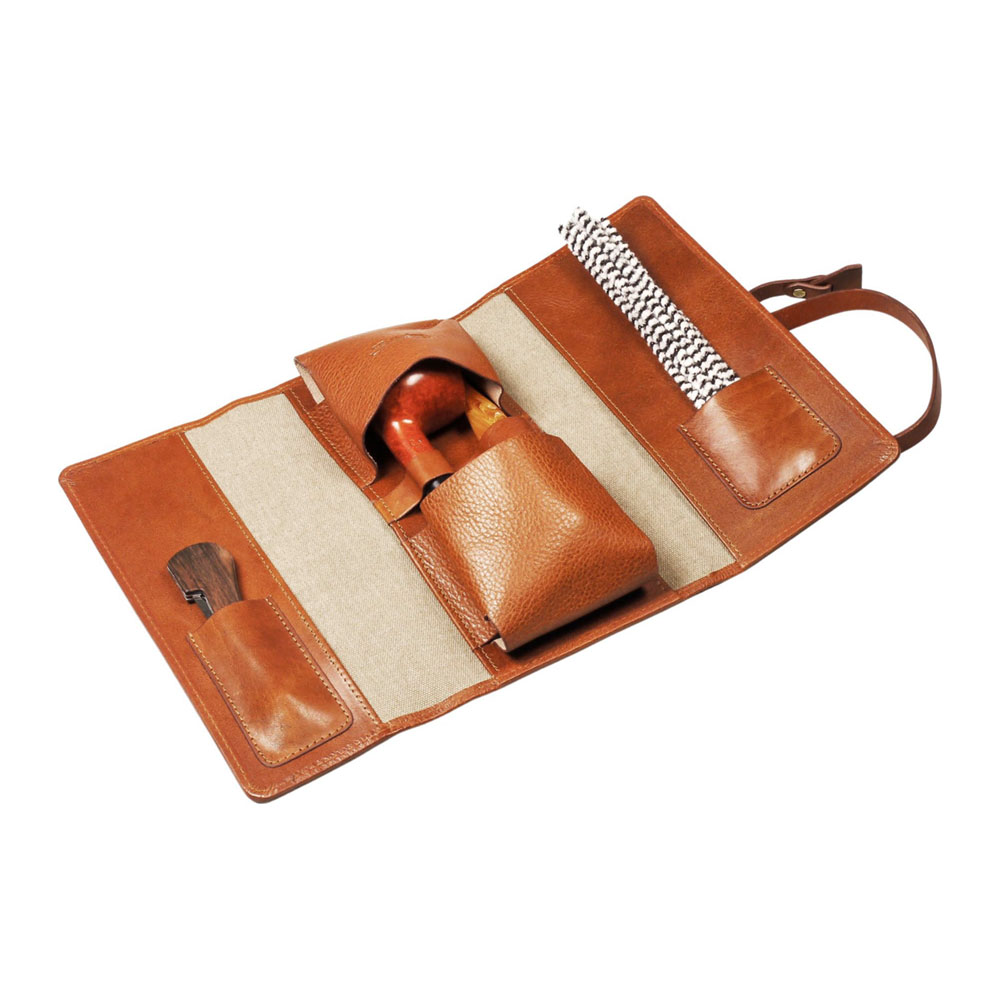 In der Haupttasche dieses Beutels können zwei Pfeifen sicher verstaut werden. Durch das sie umgebende Leder werden sie vor Verkratzung geschützt. Zusätzlich bieten weitere Taschen genug Platz für Pfeifenbesteck und -reiniger, Tabak und Feuerzeug.