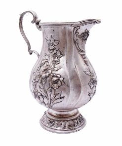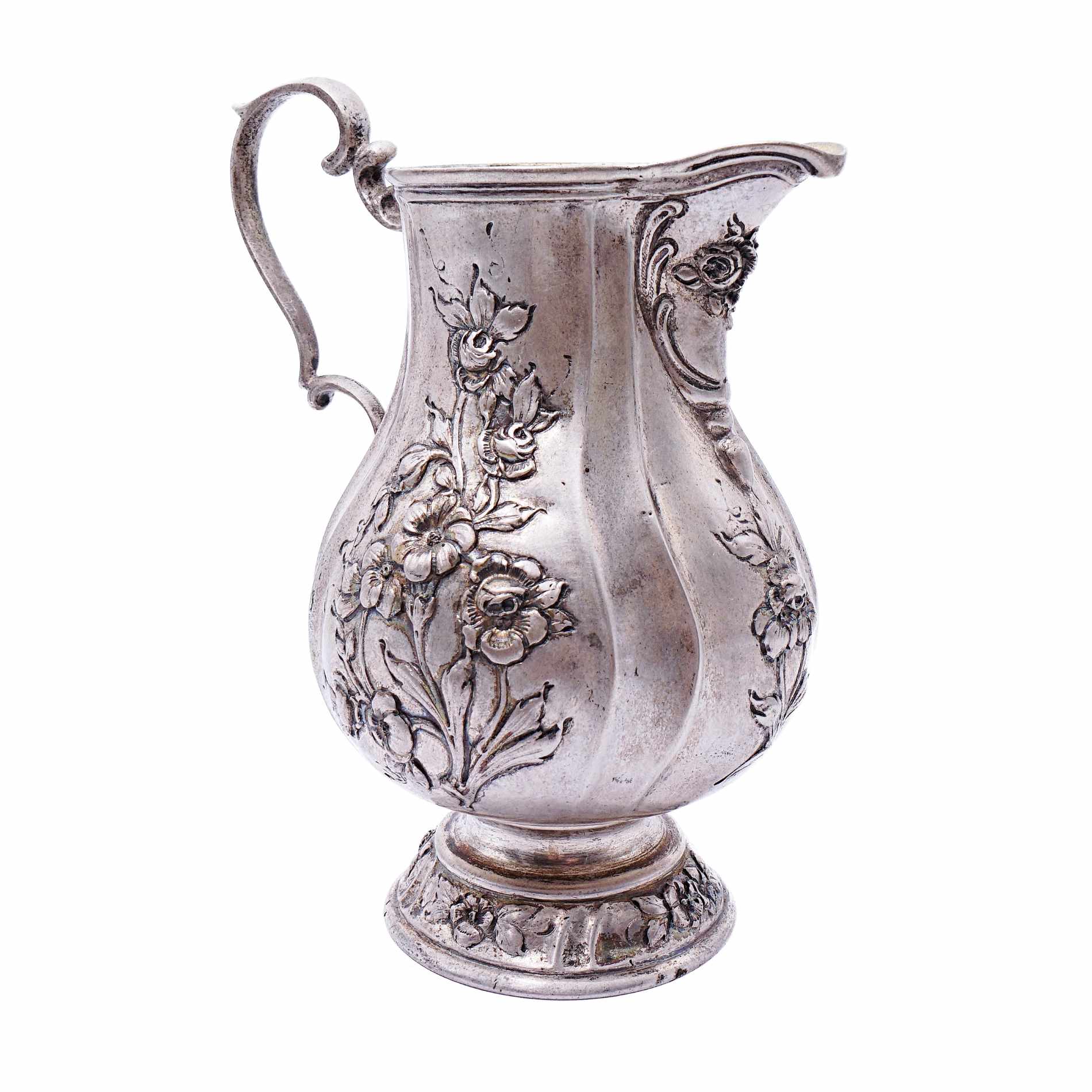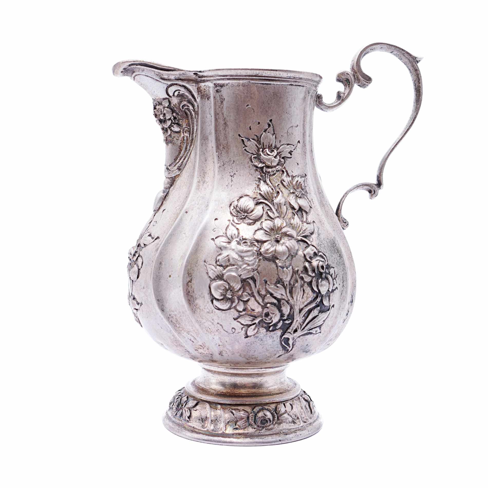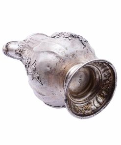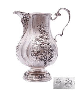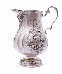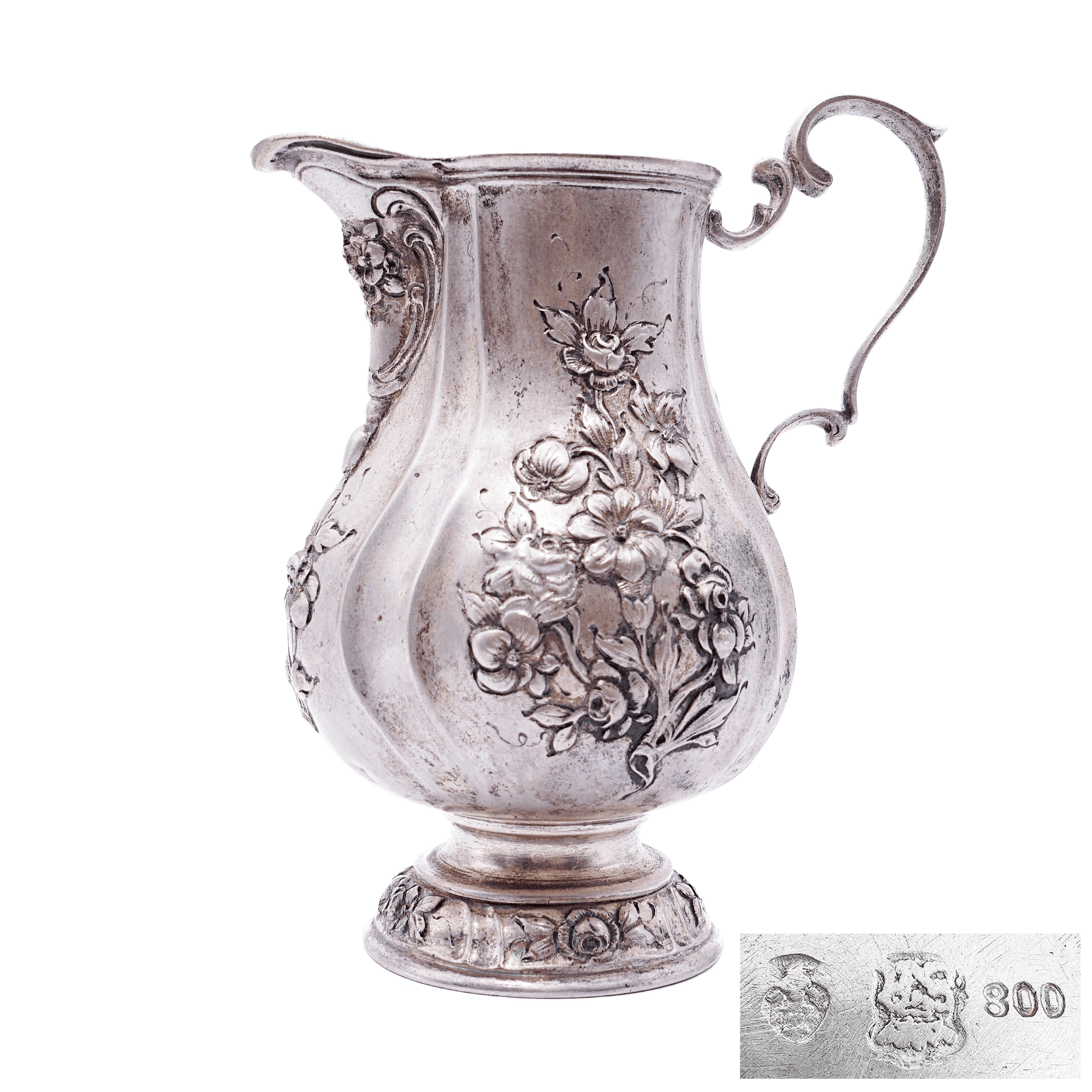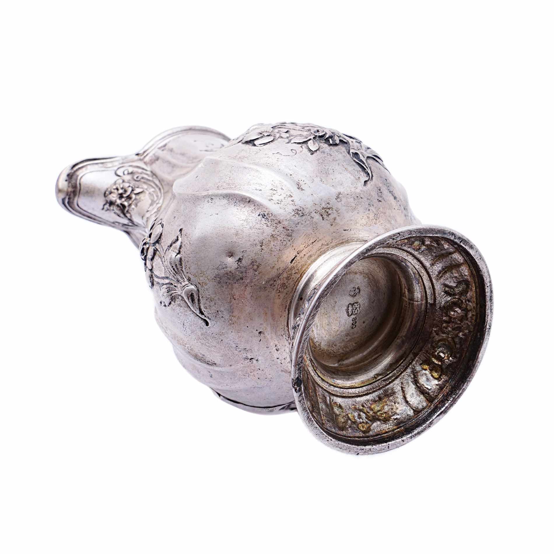 Formschönes Rahmkännchen mit dezent geschweifter Wandung, Ohrenhenkel, kurzem Rundstand und herrlichen herausgearbeiteten Blumen und Rosendekorierungen. Unterseitig mit „Hanauer Pseudomarken“ versehen. Bad Kissingen als Standort von Silberschmied Simon Rosenau liegt unweit von Hanau entfernt.