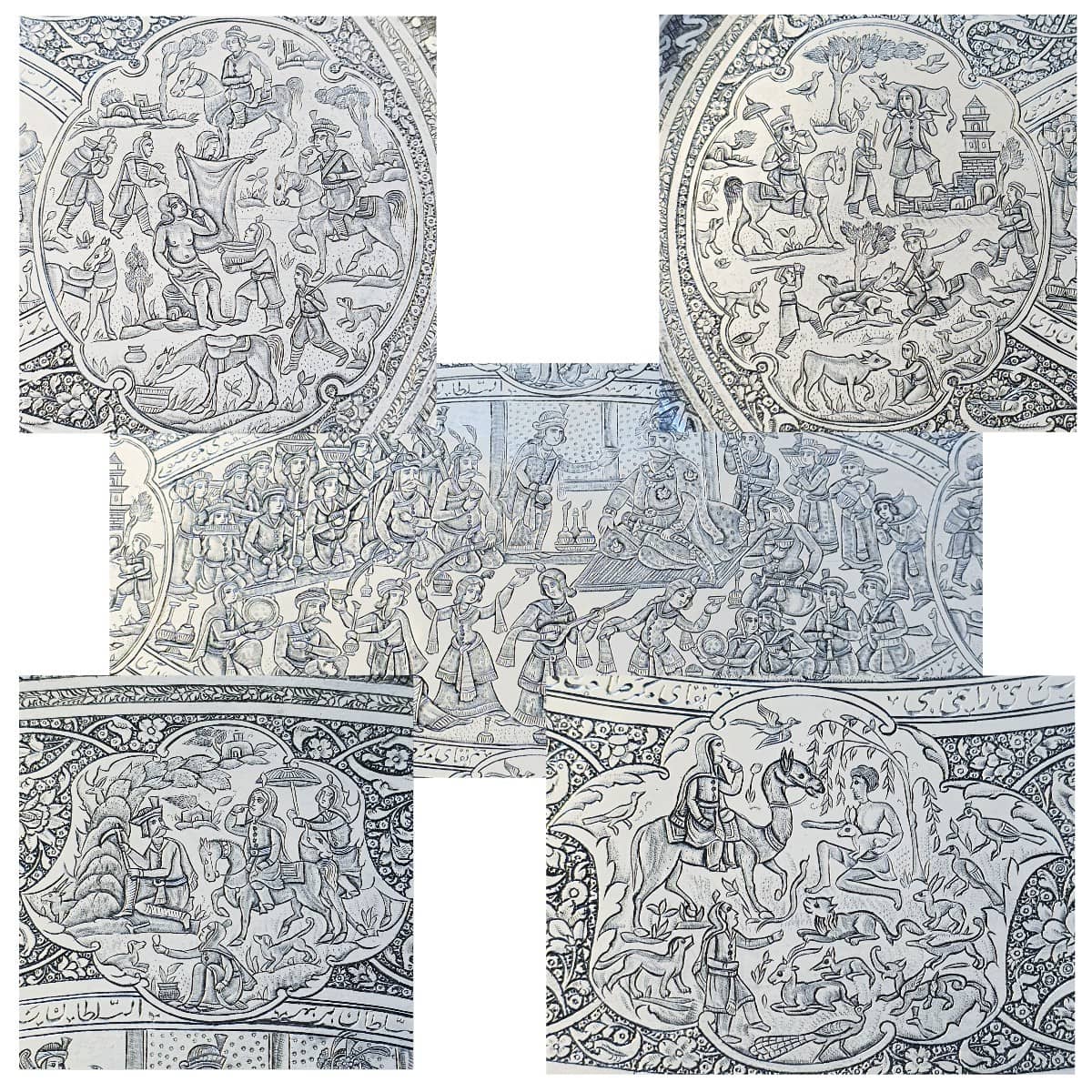 Der ovale Spiegel ist über und über mit fein ziselierten Szenen bedeckt: zentral eine üppige Hofszene mit Tänzerinnen, Musikanten und einem thronenden Herrscher. Umrahmt wird diese Szene von detailreichen Darstellungen des höfischen Lebens, der Jagd, von Natur- und Alltagsszenen. Die Figuren tragen typische Gewänder der Qajar-Epoche, ergänzt durch arabeske Blumenmotive und persische Schriftzüge in eleganter Nastaʿlīq-Kalligrafie.