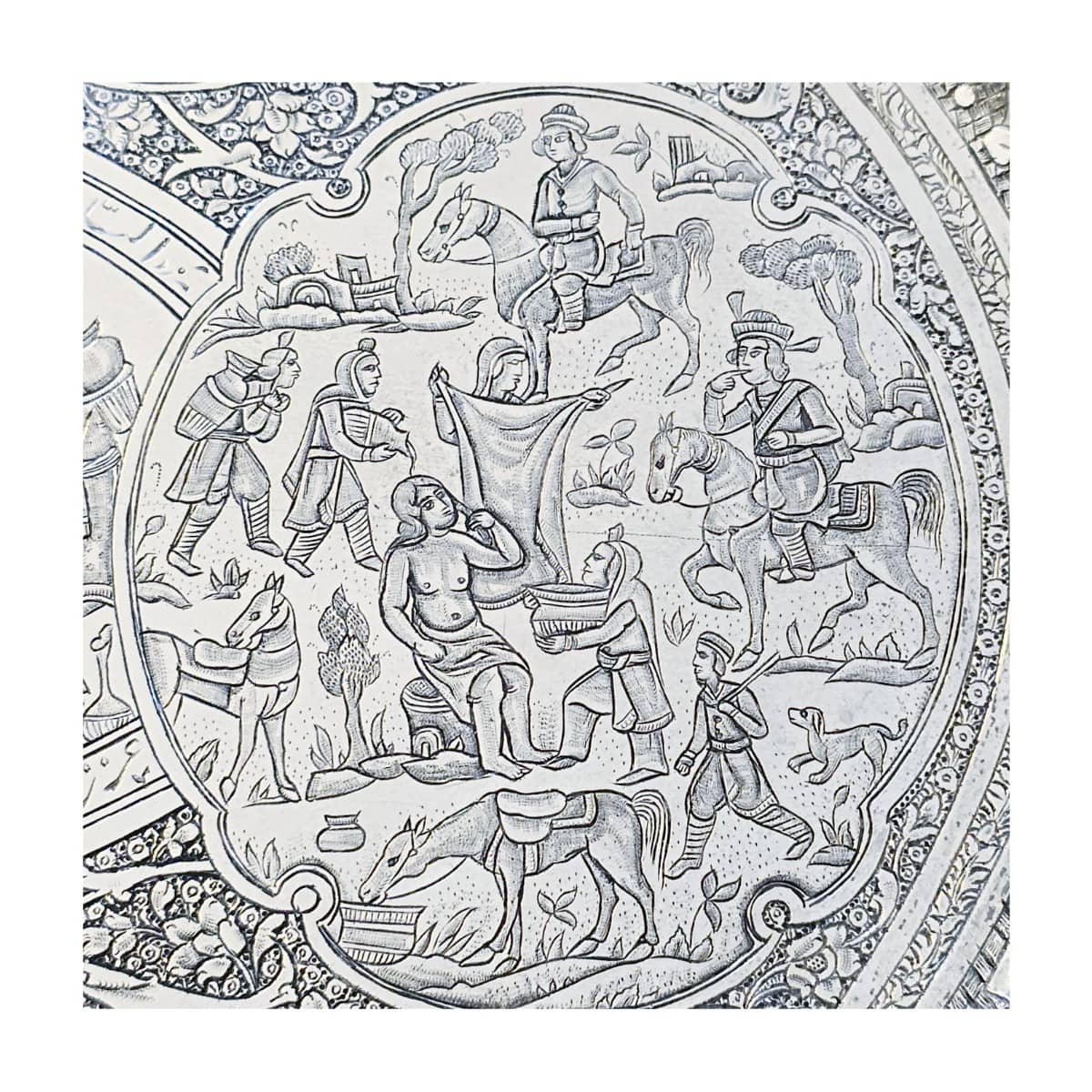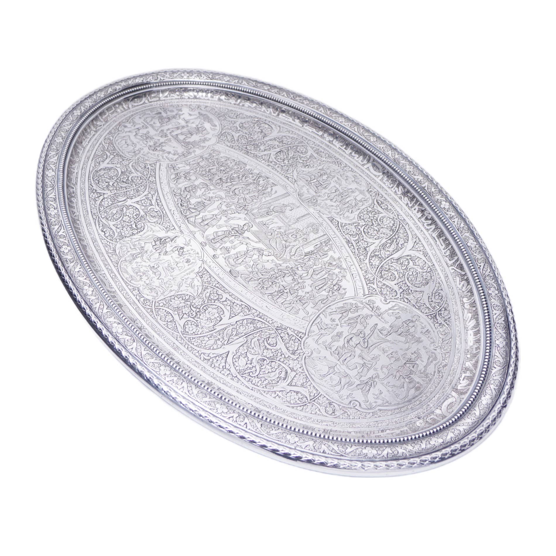 Dieses außergewöhnlich fein gearbeitete Tablett stammt vermutlich aus Isfahan (Iran) und ist ein eindrucksvolles Beispiel persischer Silberschmiedekunst im Qajar-Stil des späten 19. bis frühen 20. Jahrhunderts. Mit einer Größe von 42,3 cm x 28,8 cm und einem Gewicht von 760,7 Gramm zeugt es von handwerklicher Qualität und hohem künstlerischem Anspruch.