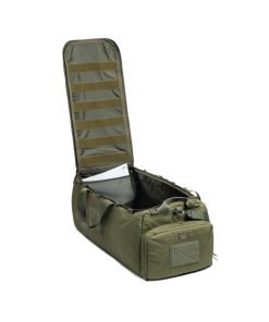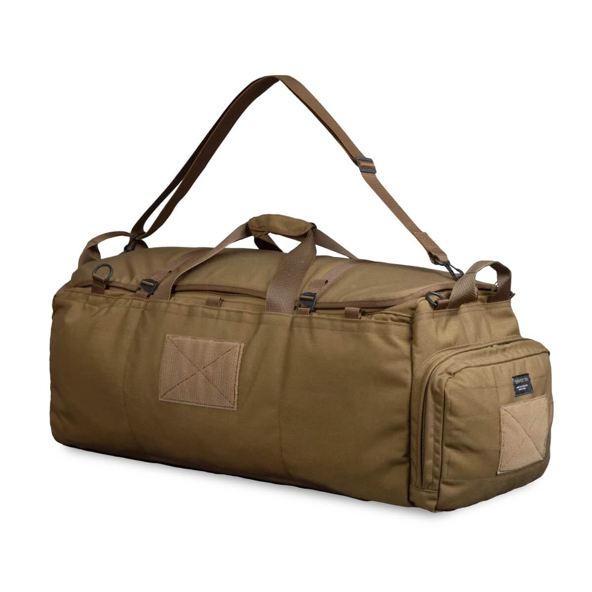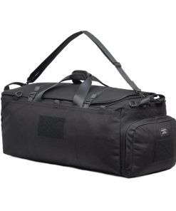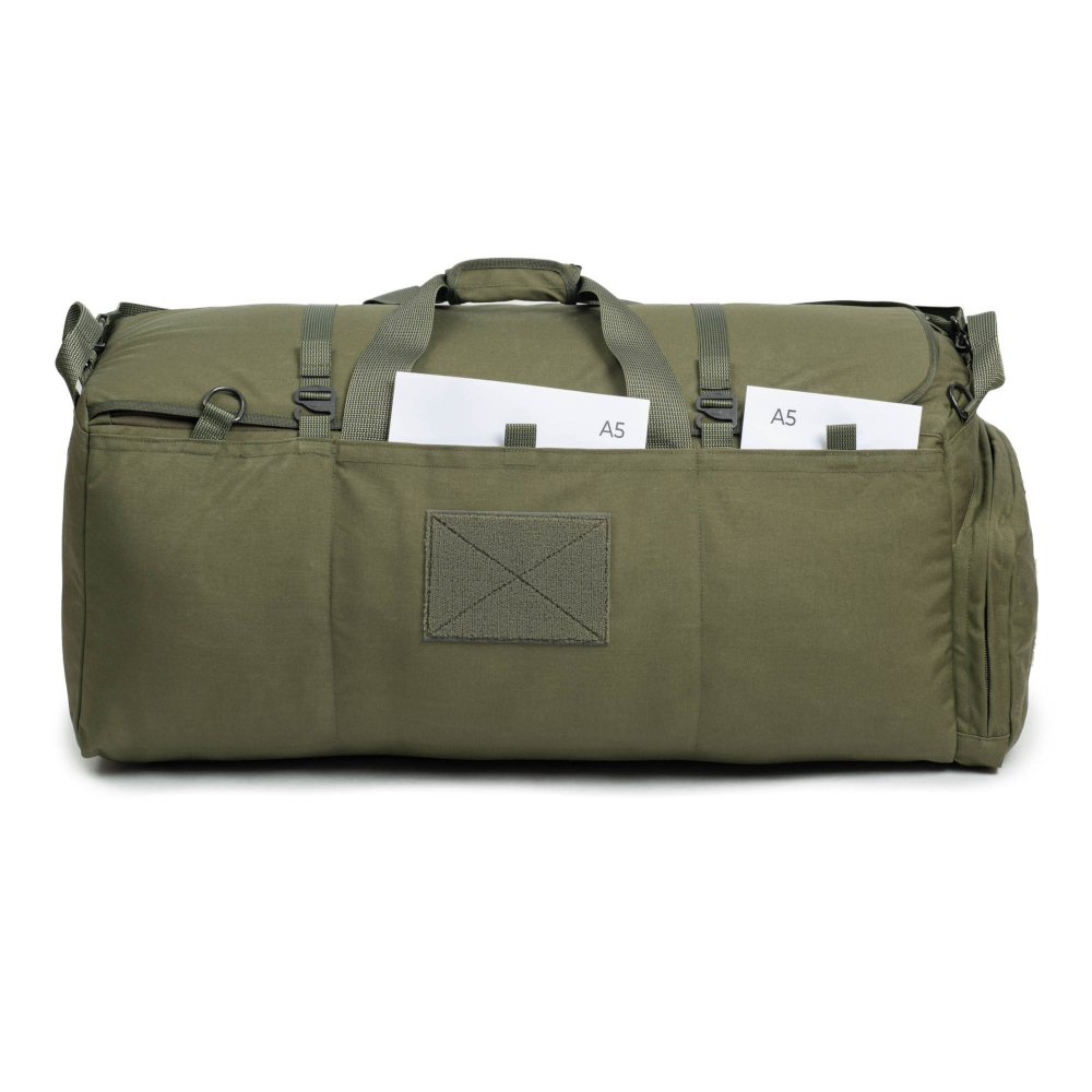Das Hauptfach misst 35 x 30 x 75 cm und ist über eine große Reißverschlussöffnung zugänglich. Die Innenseite des Deckels verfügt über Flauschstreifen zur Befestigung von Haken-basierten Accessoires. Das Hauptfach ist ein einziger großer Stauraum mit zwei Netztaschen an jedem Ende zur Organisation kleinerer Gegenstände. Zwei G‑Hook Kompressionsriemen helfen, die Belastung des Reißverschlusses zu verringern, wenn die Tasche vollgepackt ist. Die äußere Seitentasche misst 35 x 23 x 5 cm und ist für den schnellen Zugriff und die Organisation kleinerer Gegenstände sowie A4-Dokumente ausgelegt. Die Rückwand verfügt über zwei flache Netztaschen, einen D‑Ring und zwei Gurtbandschlaufen zur Sicherung von Wertsachen mittels Dummy-Cord oder Schnallen. Die Innenseite der Vorderwand enthält Flausch zur Befestigung von Haken-basierten Accessoires. Die flachen Außentaschen mit Haken- und Schlaufenverschluss messen 24 x 20 cm und sind ideal für A5-Dokumente und ähnliche kleinere Gegenstände. Zwei 10 x 15 cm große Flauschflächen an der Seite und am Ende der Tasche bieten Platz für Namensschilder und andere Identifikatoren. Jeder D‑Ring kann ebenfalls verwendet werden, um Namensschilder zu befestigen.