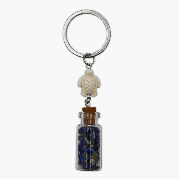 Der charmante Schlüsselanhänger kombiniert eine „Wunschflasche“ gefüllt mit Sodalith-Edelsteinsplitter und eine süße Schildkröte. Dieser persönliche Glücksbringer symbolisiert Hoffnung, positive Energie, Langlebigkeit und Schutz in einem. Perfekt für jeden, der an die Kraft von Edelsteinen und Symbolen glaubt!