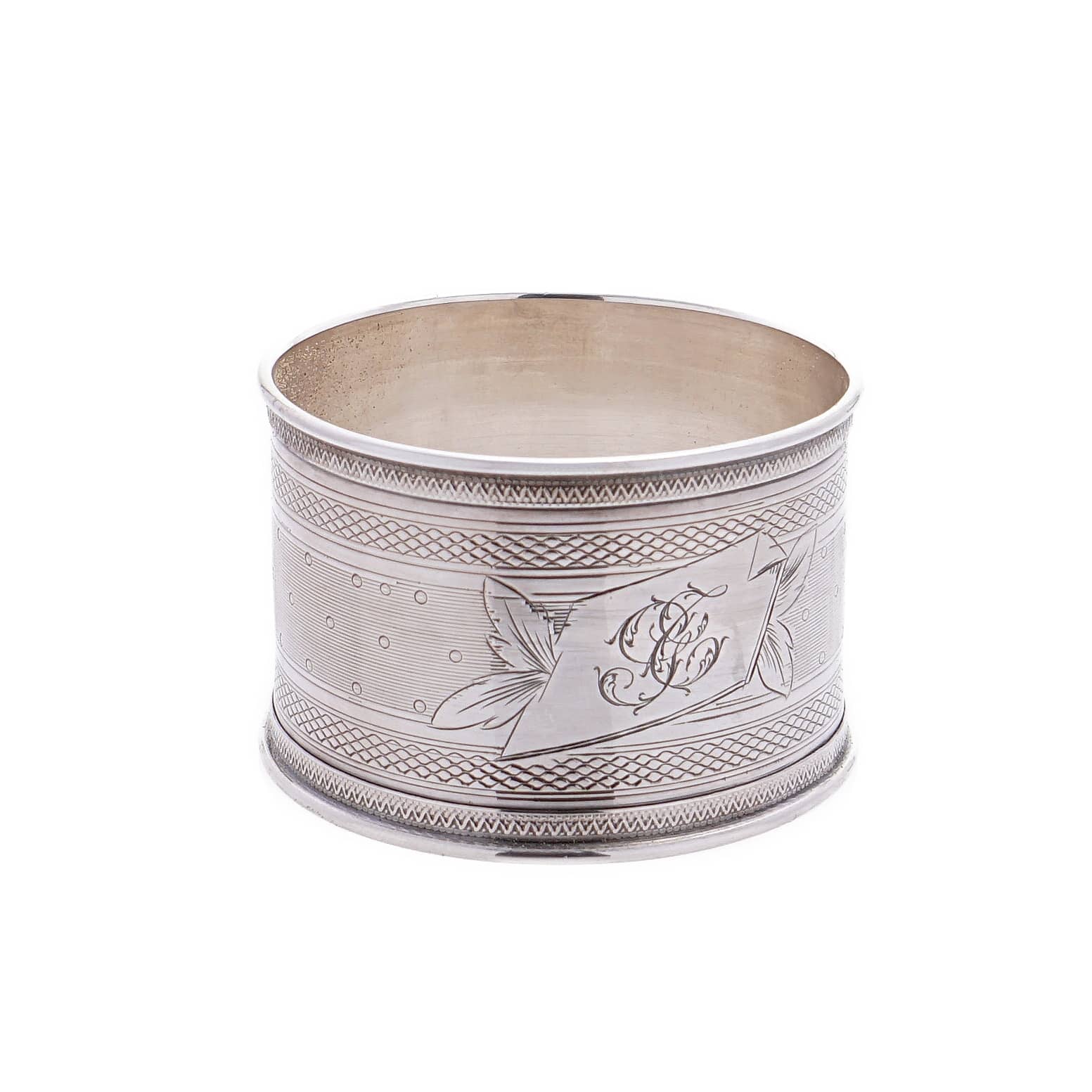 Breiter Serviettenring aus hochlegiertem 950er Silber. Guillochiert und im Zeichen des frühen Jugendstil dekoriert. Mit Meisterzeichen und franz. Garantiestempel.
