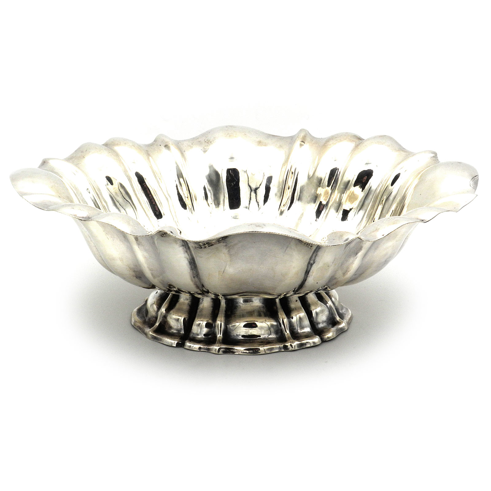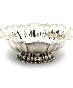 Elegante ovale Silber Schale auf eingezogenem Fuß, geschweifter Korpus mit gefältelter Wandung und geschweiftem Rand.