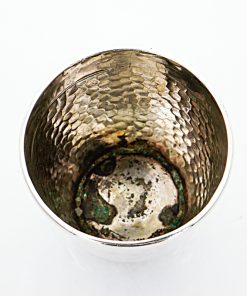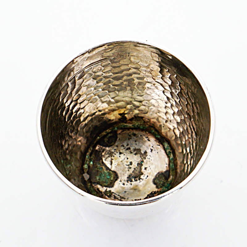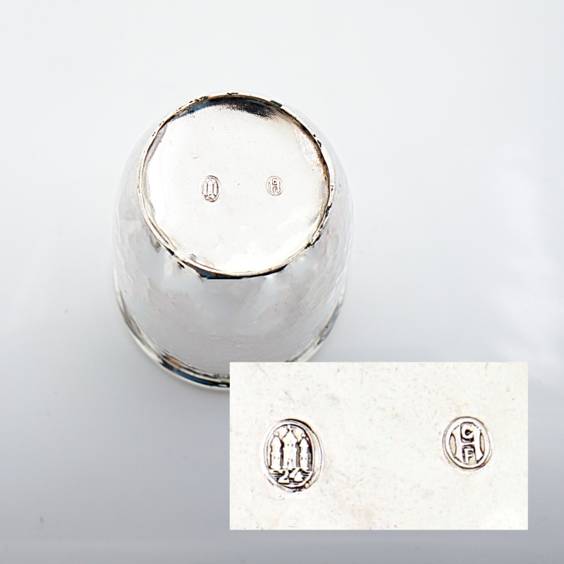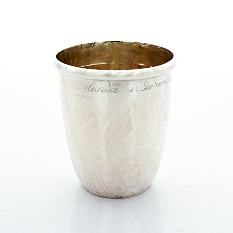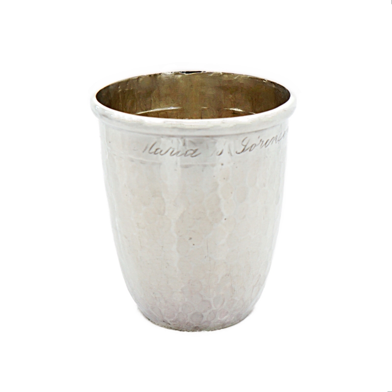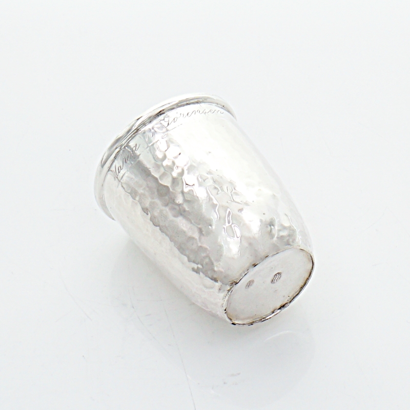 Schöner Silberbecher mit Hammerschlagdekor und gaviertem Namenszug. Der Silberbecher stammt aus der Manufaktur Christian Frederik Heise aus Copenhagen in Dänemark. Unterseitig entsprechend punziert.