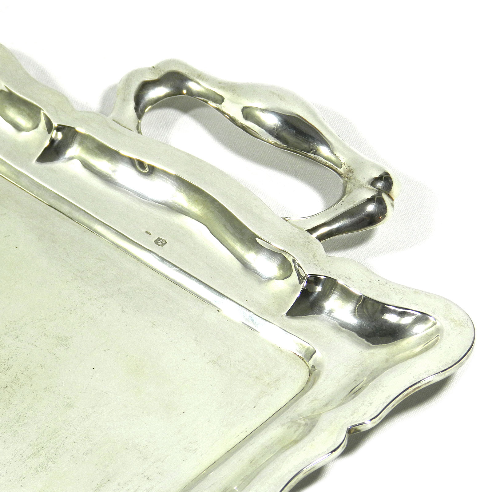 Dekoratives Silbertablett im Barockstil, glatter Spiegel mit passig geschweiftem, getreppt ansteigendem Rand und seitlichen Griffen.