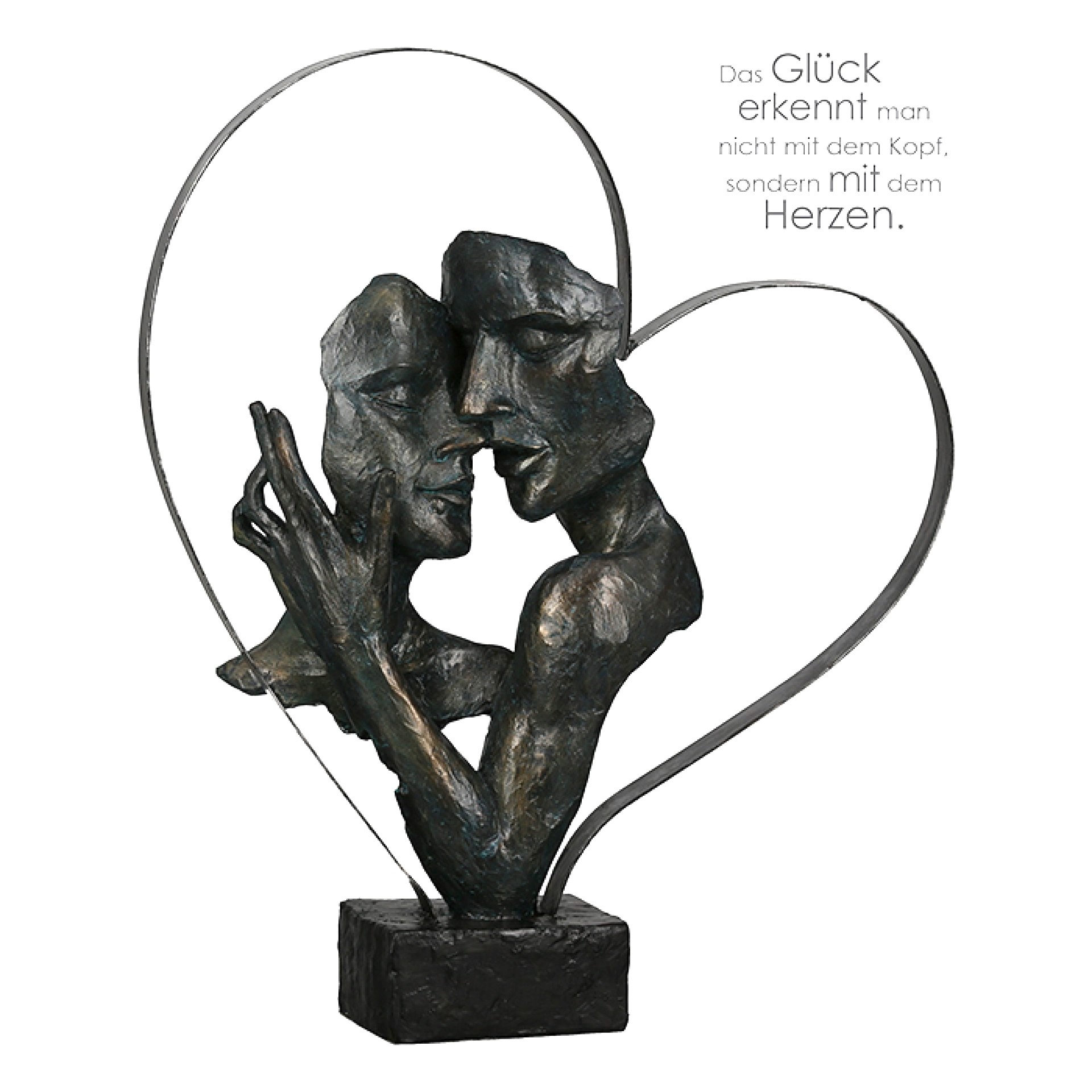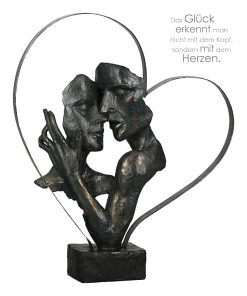 Die Skulptur ESSENTIAL Casablanca H 37 cm zeigt abstrakte Köpfe von zwei Liebenden, die sich in einem Metallherz befinden. Mit einer Höhe von 37 cm strahlt die Skulptur eine tiefe Verbundenheit und Liebe aus. Der Sinnspruch “Das Glück erkennt man nicht mit dem Kopf, sondern mit dem Herzen” unterstreicht die Bedeutung von Emotionen und Intuition bei der Wahrnehmung des Glücks.