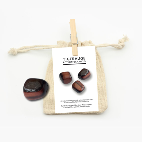 Zur optimalen Aufbewahrung wird der Tigerauge rot-Trommelstein in einem Natur-Jutebeutel geschützt. Eine ausführliche Beschreibungskarte wird mitgeliefert. Auf dieser sind allgemeine Informationen sowie die Heilwirkungen auf Körper, Geist und Seele gut zum Immer-wieder-Nachlesen zusammengefasst.
