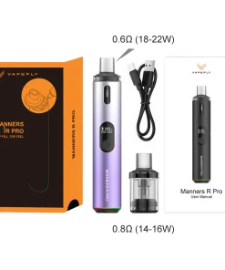 Das Vapefly Manners R Pro Kit wird von einem eingebauten 1100-mAh-Akku mit max. 30 W und Typ-C-Ladefunktion angetrieben. Dank der präzisen Luftstromeinstellung können Sie MTL- bis RDL-Dampfen und hervorragenden Geschmack genießen. Es verwendet die Manners R Pro Pod-Kartusche (2 ml, obere Füllung, im Lieferumfang enthalten) und ist auch mit der Manners R Pod-Kartusche (3 ml, seitliche Füllung) kompatibel. Es ist mit einem Knopf-/Auto-Draw-Modus für Ihre Option und RGB-Licht ausgestattet.