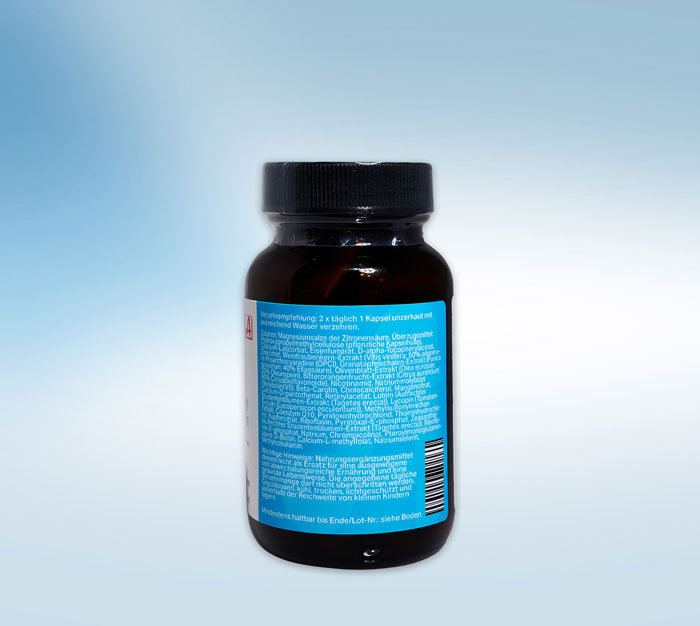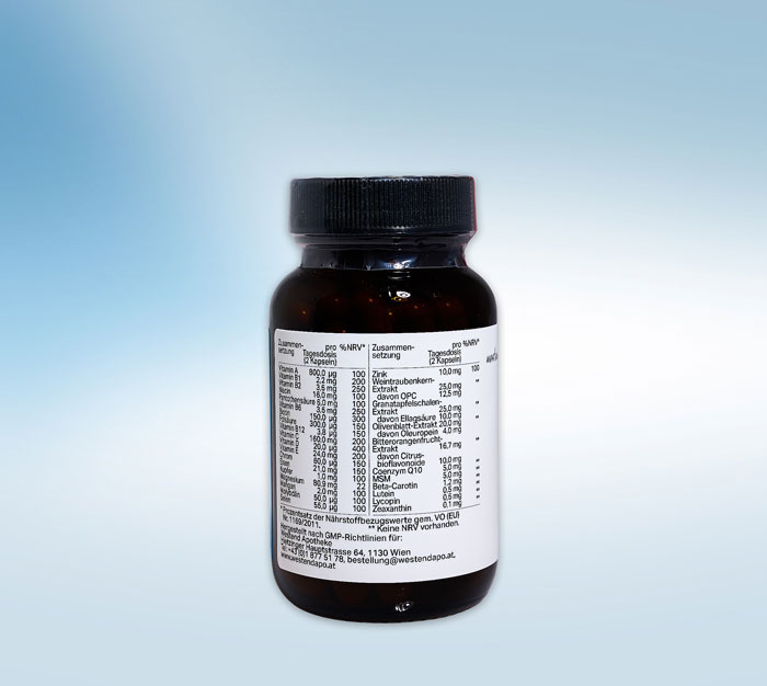 granatum; 40% Ellagsäure), Olivenblatt-Extrakt (Olea europae; 20% Oleuropein), Bitterorangenfrucht-Extrakt (Citrus aurantium; 60% Citrusbioflavonoide), Nicotinamid, Natriummolybdat (Molybdän(VI)), Beta-Carotin, Cholecalciferol, Mangancitrat, Calcium-D-pantothenat, Retinylacetat, Lutein (Aufrechter Studentenblumen-Extrakt (Tagetes erecta)), Lycopin (Tomaten-Extrakt (Lycopersicon esculentum)), Methylsulfonylmethan (MSM), Coenzym Q10, Pyridoxinhydrochlorid, Thiaminhydrochlorid, Kupfercitrat, Riboflavin, Pyridoxal-5‘-phosphat, Zeaxanthin (Aufrechter Studentenblumen-Extrakt
