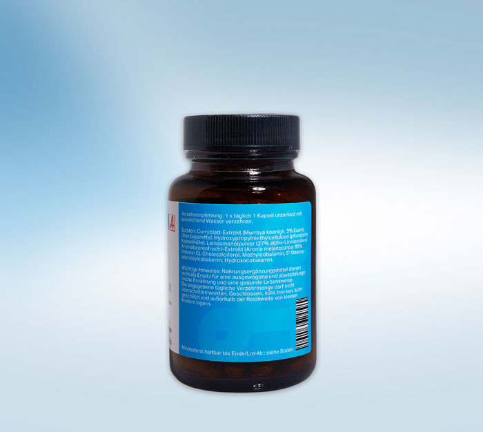 Um auch den Eisenbedarf zu decken, enthalten unsere Kapseln Eisen aus dem Curryblatt. Das im Curryblatt organisch gebundene, natürliche Eisen wird besonders gut resorbiert und verursacht auch in hohen Dosen keine Magenreizungen. Zusammen mit Vitamin C wird die Bioverfügbarkeit weiter verbessert. Das Omega-3-Öl aus Leinsamen besteht zu einem hohen Anteil aus alpha-Linolensäure, das in unserem Körper weiter zu DHA und EPA verstoffwechselt werden kann. Omega-3-Öl unterstützt die Gesundheit des Herzens, trägt zur normalen Gehirnfunktion bei und hilft, entzündungshemmende Prozesse im Körper zu beschleunigen.