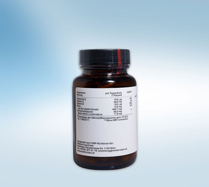 Curryblatt-Extrakt (Murraya koenigii; 3% Eisen), Überzugsmittel Hydroxypropylmethylcellulose (pflanzliche Kapselhülle), Leinsamenölpulver (27% alpha-Linolensäure), Aroniabeerenfrucht-Extrakt (Aronia melanocarpa; 80% Vitamin C), Cholecalciferol, Methylcobalamin, 5′-Desoxyadenosylcobalamin, Hydroxocobalamin